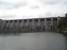 The Gandhi Sagar Dam is one of the four major dams built on India's Chambal River. The dam is located in the Mandsaur, Neemuch districts of the state of Madhya Pradesh. It is a masonry gravity dam, standing 62.17 metres (204.0 ft) high,[1] with a gross storage capacity of 7.322 billion cubic metres from a catchment area of 22,584 km2 (8,720 sq mi). The dam's foundation stone was laid by Prime Minister of India Pandit Jawaharlal Nehru on 7 March 1954,[2] and construction of the main dam was done by leading contractor Dwarka Das Agrawal & Associates and was completed in 1960. Additional dam structures were completed downstream in the 1970s.