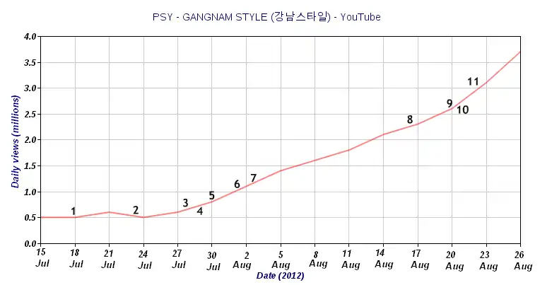 On September 3, 2012, the number of daily views generated by "Gangnam Style" went past the five-million mark.[29] By the end of September, it had topped the iTunes charts in 31 countries.[30]