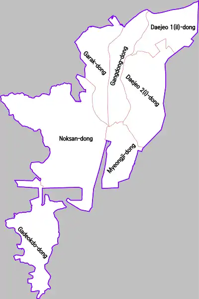 - Songjeong-dong, Hwajeon-dong, Noksan-dong, Saenggok-dong, Gurang-dong, Jisa-dong, Mieum-dong, Beombang-dong, Sinho-dong