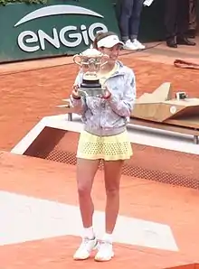 At the 2018 Qatar Total Open, Muguruza was advanced to the final after the withdrew of Simona Halep before their semifinal match.[8] She failed to win the title, losing to Petra Kvitová.[9] In April, she won International-level Monterrey Open, defeating Tímea Babos in the final.[10] At the French Open, she reached semifinal, losing to Simona Halep in straight-sets.[11] She debuted at the year-end championships WTA Elite Trophy, losing to Wang Qiang in the semifinal. In March 2019, she reached her second quarterfinal at the Indian Wells Open, losing to eventual champion Bianca Andreescu.[12] There she also recorded top 10 wins over world No. 7 Kiki Bertens and world No. 10 Serena Williams.[13] For the second time in a row, she won Monterrey Open, this time defeating Victoria Azarenka in the final.[14] Success did not came at the Fed Cup, where she lost both matches against Belgium.