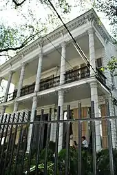 - Alfred Grima House, 2701 St. Charles Avenue, built in 1857 in the Greek Revival style by Cornelius Bicknell Payne, sold in 1861 to Thomas L. Clarke. Acquired from the Clarke family in 1890 by Alfred Grima, attorney, extensively remodeled in 1891, Paul Andry, architect, John McNally, builder. The side formal garden was completed in 1925, Charles R. Armstrong, architect, and the garden trellis was built in 1926, the last work of Samuel S. Labouisse, architect. Residence at the time of her death in 1981 of Clarisse Claiborne Grima, widow of Alfred Grima Jr., who donated it to the Historic New Orleans Collection. Acquired by private ownership in 1987. (Marker by Orleans Parish Landmarks Commission)[29]
