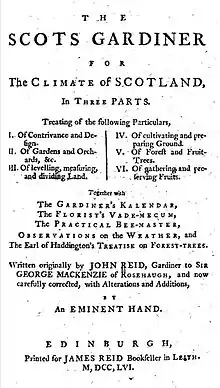 Gardening books from the continent and England became widely available in this period and the first gardening book was published in Scotland.[2] This was John Reid's, Scots Gard'ner (1683). Reid had been gardener at Niddry Castle, Hamilton Castle, and Drummond Castle and for George Mackenzie of Rosehaugh.[10][11] The book borrowed from John Evelyn's (1658) translation of Nicholas de Bonnefon's Le jardinier françois (1651), adapting its ideas for Scottish conditions.[2]