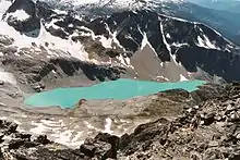 There are over 150 glaciers in the park, including the Garibaldi Névé and Mamquam icefields.[10] The highest peak in Garibaldi Park is Wedge Mountain, at an elevation of 2,891 metres (9,485 ft).[11] It also includes volcanic features such as an andesite tuya known as The Table, a cinder cone known as the Opal Cone, and the stratovolcanoes Mount Garibaldi and The Black Tusk, which are part of the Garibaldi Volcanic Belt.
