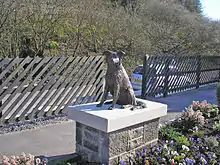 The southbound platform features a life-size bronze statue of a Border Collie dog named Ruswarp (pronounced /rʌsəp/). Ruswarp belonged to Graham Nuttall, one of the founding members of the group that saved the Settle-Carlisle Railway from closure. The dog was featured in the campaign, signing the petition to save the line with a paw-print. Nuttall disappeared while walking with Ruswarp in the Welsh Mountains on 20 January 1990. His body was found on 7 April; Ruswarp was still alive after standing guard over his owner's body for 11 weeks and died shortly after attending the funeral.[12] The sculpture by Joel Walker is a memorial to both Graham Nuttall, Ruswarp and the campaign to save the line from closure. It was unveiled on 11 April 2009, 20 years after the line was saved from closure.[13] The station waiting rooms, previously out of use due to leaking roofs, were also refurbished and reopened to the public as part of the ceremony.[3]