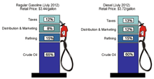 Finished motor gasoline amounts to 44% of the total US consumption of petroleum products.[6] This corresponds to 18.5 exajoules per year (5.1 trillion kilowatt-hours per year). As of 2012, the cost of crude oil accounted for 62% of the cost of a gallon of gasoline in the United States while refining accounted for just 12%. Taxes and distribution/marketing accounted for 12% and 14% respectively.[7]