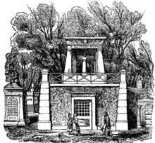 Gaspard Monge, whose remains are deposited in the burying ground in Père Lachaise Cemetery, at Paris, in a magnificent mausoleum, was professor of geometry in the École polytechnique at Paris, and with Denon accompanied Napoleon Bonaparte on his memorable expedition to Egypt; one to make drawings of the architectural antiquities and sculpture, and the other the geographical delineations of that ancient country. He returned to Paris, where he assisted Denon in the publication of his antiquities. At his decease the pupils of the Polytechnique School erected this mausoleum to his memory, as a testimony of their esteem, after a design made by his friend, Monsieur Denon. The mausoleum is of Egyptian architecture, with which Denon had become familiarly acquainted.
