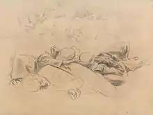 The painting was completed in March 1919, and Sargent was paid his £600 fee. It was first displayed at the Royal Academy in London in 1919.[8] It was voted picture of the year by the Royal Academy of Arts in 1919.[5][9] The painting was not universally liked: E. M. Forster considered it too heroic.[5] Winston Churchill praised its "brilliant genius and painful significance", but Virginia Woolf attacked its patriotism.[10] It is now held by the Imperial War Museum, along with several charcoal studies for the painting.[11] Other charcoal sketches are held by the Corcoran Gallery of Art. A small 10½ x 27¼ in. (26 x 69 cm) oil sketch, originally owned by Evan Charteris, was sold by Christie's in 2003 for £162,050 ($267,869).[4]
