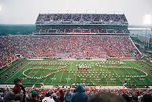 There are two main reasons why the stadium was not originally a fully enclosed "bowl" like, for example, Michigan Stadium or the Rose Bowl. First, access to the three outdoor football practice fields, which are behind the south end zone seats, would have been restricted by completely enclosing the south end of the stadium. Secondly, any enclosure would have forced the baseball field, which shared its outfield with the practice fields until 1982, to shorten its left field line considerably.[5][8]