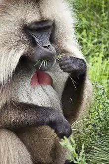 Geladas are the only primates that are primarily graminivores and grazers – grass blades make up to 90% of their diet. They eat both the blades and the seeds of grasses. When both blades and seeds are available, geladas prefer the seeds. They eat flowers, rhizomes and roots when available,[12][13] using their hands to dig for the latter two. They consume herbs, small plants, fruits, creepers, bushes and thistles.[12][13] Insects can be eaten, but only rarely and only if they can easily be obtained. During the dry season, grasses are eaten less and herbs are preferred. Geladas consume their food more like ungulates than primates, and they can chew their food as effectively as zebra.[14]
