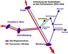 There are connections in Gemünden am Main to Schlüchtern, Aschaffenburg and Würzburg; and in Ebenhausen to Erfurt and Meiningen.