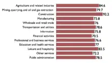 Men are over-represented in dangerous jobs. The industries with the highest death rates are mining, agriculture, forestry, fishing, and construction, all of which employ more men than women.[115] In one U.S. study, 93% of deaths on the job involved men,[116] with a death rate approximately 11 times higher than women.