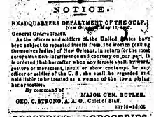 General Order No. 28 was a military decree made by Maj. Gen. Benjamin Butler during the American Civil War.[1] Following the Battle of New Orleans, Butler established himself as military commander of that city on May 1, 1862. Many of the city's inhabitants were strongly hostile to the Federal government, and many women in particular expressed this contempt by insulting Union troops.