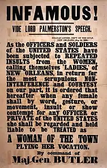 - As the officers and soldiers of the United States have been subject to repeated insults from the women (calling themselves ladies) of New Orleans in return for the most scrupulous non-interference and courtesy on our part, it is ordered that hereafter when any female shall by word, gesture, or movement insult or show contempt for any officer or soldier of the United States she shall be regarded and held liable to be treated as a woman of the town plying her avocation.