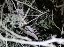 All genet species have a dark stripe along the spine; they differ in fur color and spot pattern. Their size varies between species from 40.9 to 60 cm (16.1 to 23.6 in) in head-to-body length with 40 to 47 cm (16 to 19 in) long tails; their tails are almost as long as head and body.[1][42] They have large eyes with elliptical pupils; the iris is about the color of the fur. They can move their eyes within their sockets to a limited extent, and move their heads to focus on moving objects. Their ear pinnae have a fine layer of hair inside and outside. They can move the pinnae by about 80° from pointing forward to the side, and also from an erect position to pointing downwards. Their wet nose is important for both sensing smell and touch.[43]