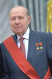 Novozhilov served as a deputy of the Supreme Soviet of the USSR from 1974 to 1989, then as a People's Deputy of the USSR from 1989.[2][5][8] He became a member of the Central Committee of the Communist Party of the Soviet Union in 1986.[4] As well as his two Heroes of Socialist Labour, Novozhilov held a number of other state awards. He was awarded the Order of Lenin three times, on 10 February 1969, 26 April 1971 and 23 June 1981; the Order of the October Revolution on 27 October 1975; the Order of the Red Banner of Labour on 22 July 1966; the Order of the Badge of Honour on 7 December 1957; and the Order of Friendship of Peoples on 29 December 1992.[5][9] He also received the Order of Holy Prince Daniel of Moscow Third Class and the Order "For Merit to the Fatherland" in all three classes.[9][3] He had married Lyudmila Ivanovna Lisina, a philologist on 23 April 1966.[3] The couple had a son, Sergey Genrikhovich, born in 1967, who became an aircraft engineer.[2] Late in life Genrikh Novozhilov listed his interests as tennis and photography.[9][3]