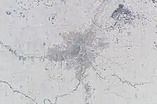 Winnipeg has moderate precipitation with 513.7 mm (20.22 in) of precip per year.[18] There is measurable rainfall on 76.9 days throughout the year, and 54.7 days with snowfall.[18] Most of the precipitation occurs in the warmer months, with June being the wettest month and February being the driest. Droughts can take place in the region, however they do not happen as frequently as cities further west like Calgary or Swift Current. During the winter Winnipeg will get precipitation mostly in the form of snow, with 36 days of snow falling from December to February. Even in the winter there is occasional rainfall with 2.5 days on average of rainfall during December to February.[32] Other forms of winter precipitation include ice, sleet, and freezing rain. Snow cover usually lasts from November till March, about 132 days or 36% of the year;.[35] The city frequently gets thunderstorms during the summer, averaging 27 days a year with thunderstorms.[26]