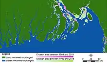 Bangladesh coastal areas are covering the south part of Bangladesh. The main rivers of Bangladesh derived from the Himalayas carry a high level of sediment and deposit it across the Bay of Bengal. This has led to major changes in the coastal region between 1989 and 2018. Over 30 years morphological changes many islands are losing land area. However, there has been an overall net gain in the land area due to the regular acceleration process in other parts of those islands. In the west, new islands were found, but no significant changes were observed. At the mouth of the Meghna estuary, noticeable variable changes have been observed with the formation of many new islands.