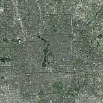 Satellite image of the city of Beijing, with the Forbidden City in the center, just north of Tiananmen Square and west of a string of lakes. Also visible are Yuyuantan lake in the west and the southern city moat, which once surrounded the walled outer city.