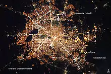 Galveston Bay is a central feature of the Greater Houston metropolitan area. The bay serves an essential economic role as home of the Houston Ship Channel and a large fishing industry, and is also an important destination for recreation and coastal wildlife. Covering approximately 600 square miles (1,600 km2), the estuary extends 30 miles (48 km) inland from the coast and has a maximum width of 17 miles (27 km).[23] Important regional communities, including Galveston and Texas City, are located along the bay. While the City of Houston proper does not adjoin the bay, its limits do extend southward to encompass the NASA Johnson Space Center and the community of Clear Lake.[24]