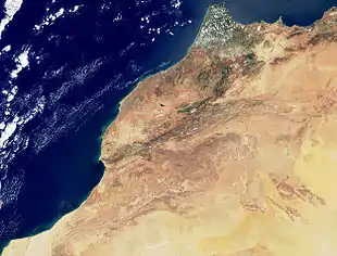 Moreover, analysis of these environmental changes on the economy of Morocco are expected to create challenges at all levels of the economy, especially in the agricultural systems and fisheries which employ half of the population, and account for 14% of GDP.[1] In addition, because 60% of the population and most of the industrial activity are on the coast, sea level rise is a major threat to key economic forces.[1] As of the 2019 Climate Change Performance Index, Morocco was ranked second in preparedness behind Sweden.[2]Physical geography