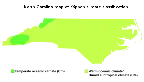 The climate of North Carolina is mild and equable. This is due in part to its geographical position; midway in the Northern Hemisphere. Also, the high Appalachian chain offers, to some extent, a shield from cold winter winds of the northwest. On the ocean side, in winter, is the moderating influence of the warm Gulf Stream, the current of which sweeps along near its shores.