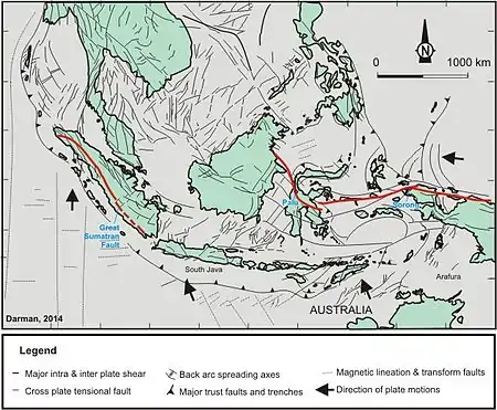 The tectonics processes in Indonesia formed major structures in Indonesia. The most prominent fault in the west of Indonesia is the Semangko Fault or the Great Sumatran Fault, a dextral strike-slip fault along Sumatra Island (about 1900 km). The formation of this fault zone is related to the subduction zone in the west of Sumatra.