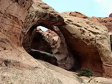 Only the two sandstone members of the Cutler Formation, the Cedar Mesa and White Rim, are exposed in the park but they cannot be easily distinguished from each other and are thus often treated as a single stratigraphic unit there.[5] The White Rim and Cedar Mesa are composed of fossilized cross-bedded sand dunes that were likely deposited in an arid coastal environment that periodically flooded with sea water. Sand in these formations are somewhat sorted by size, well-rounded (worn by abrasion), and range from very fine- to medium-grained.[6]