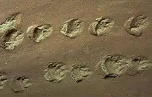 Coconino Sandstone formed about 275 million years ago as the area dried out and sand dunes made of quartz sand invaded a growing desert (see 6b in figure 1).[10] Some Coconino fills deep mudcracks in the underlying Hermit Shale[38] and the desert that created the Coconino lasted for 5 to 10 million years.[46] Today, the Coconino is a 57 to 600 feet (17 to 183 m) thick golden white to cream-colored cliff-former near the canyon's rim.[47] Cross bedding patterns of the frosted, fine-grained, well-sorted and rounded quartz grains seen in its cliffs is compatible with but does not substantiate conclusively an eolian environment.[48][32][49] Also fossilized are tracks from lizard-like creatures and what look like tracks from millipedes and scorpions.[50] An unconformity marks the top of this formation.