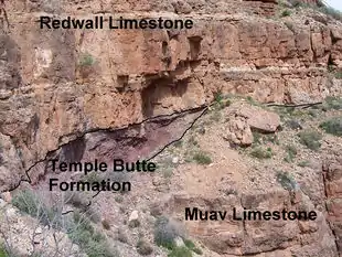 Geologists do know that deep channels were carved on the top of the Muav Limestone during this time.[31][32] Streams were the likely cause, but marine scour may be to blame. Either way, these depressions were filled with freshwater limestone about 385 million years ago in the Middle Devonian in a formation that geologists call the Temple Butte Formation (see 4a in figure 1).[10] Marble Canyon in the eastern part of the park displays these filled purplish-colored channels well.[31] Temple Butte Formation is a cliff-former in the western part of the park where it is gray to cream-colored dolomite. Fossils of animals with backbones are found in this formation; bony plates from freshwater fish in the eastern part and numerous marine fish fossils in the western part. Temple Butte Formation is 100 to 450 feet (30 to 137 m) thick; thinner near Grand Canyon Village and thicker in western Grand Canyon.[33] An unconformity representing 40 to 50 million years of lost geologic history marks the top of this formation.[34]