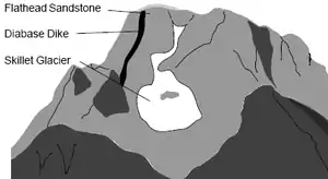 Sometime around 2.5 billion years ago, blobs of magma intruded into the older rock, forming plutons of granitic rock.[3] Extensive exposures of this rock are found in the central part of the range. About 1.3 to 1.4 billion years ago in Late Precambrian, 5 to 200 foot (1.5 to 60 m) thick black diabase dikes intruded as well, forming the prominent vertical dikes seen today on the faces of Mount Moran and Middle Teton (the dike on Mount Moran is 150 feet (46 m)).[3][4] Some of the large dikes can be seen from the Jenny Lake and String Lake areas.