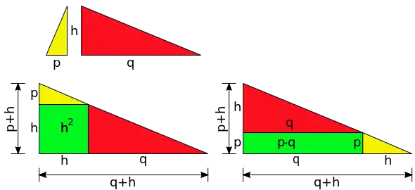 If h denotes the altitude in a right triangle and p and q the segments on the hypotenuse then the theorem can be stated as:[1]