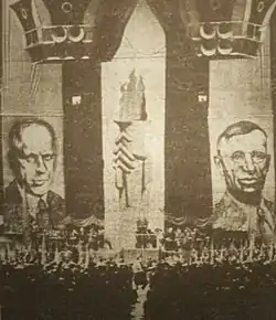 The finale of the 1936 Socialist Party campaign took place on Sunday, November 1, 1936, when the party faithful gathered at Madison Square Garden in New York City to hear Thomas, Nelson, Laidler, black Congressional candidate Frank R. Crosswaith, and Milwaukee Mayor Daniel W. Hoan. Giant portraits of Norman Thomas and George Nelson flanked the stage, with a 40-foot (12 m) tall banner of a hand-and-torch — a Socialist Party emblem — immediately behind the rostrum. Hoan and Nelson spoke from Chicago, with their voices broadcast to the huge auditorium via radio hookup. Nelson's call for America to continue "the pioneering spirit of our forefathers" towards a socialist reorganization of society drew a mighty cheer from the gathering.[14]