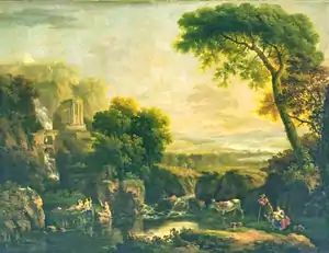 Early in his career Barret produced many oil paintings of classical scenery, often incorporating mythological figures. There is no evidence that he travelled to Italy.[5] Most, if not all, of the paintings appear to have been commissioned for houses in Ireland. Thomas Bodkin considered that the oil paintings of Tivoli in Italy to be more likely to be work of his son George Barret junior. who also produced many works with classical themes. However, these can now be securely attributed to the elder Barret.