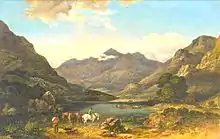 In the summer of 1777 Henry Penruddocke Wyndham made his second tour through Wales accompanied by the Swiss artist Samuel Hieronymus Grimm, who is very likely to have known Barret. Wyndham's Tour through Monmouthshire and Wales published in 1781, started with at the Severn and worked round the Welsh coast to Snowdonia before returning along the Welsh borders. This was a route followed by many tourists and Wyndham's book was the first published guidebook with illustrations of the scenery. Surviving oil-paintings by Barret suggest that he must have made a similar tour, starting in the south and many of his oil paintings are taken from similar viewpoints to those used by Grimm.[40] The Government Art Collection has oil-paintings by Barret of both the Severn and Wye confluence and Cilgerran Castle on the borders of Cardiganshire and Pembrokeshire. There are a number of paintings which may portray scenery in Merionethshire and in Snowdonia Barret produced a number of paintings of Snowdon from Llyn Nantle and Llyn Padarn. Unlike Richard Wilson he did not paint Caernarfon Castle, but he did produce at least five different versions of a painting of Conway Castle.[41]