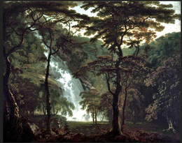 Barret was likely introduced to the Marquess of Rockingham by Edmund Burke, who had become his private secretary. The Marquess’ s Irish seat was at Coolatin, Co. Wicklow. Barret was employed to draw the remains of Killtimon Castle, Co. Wicklow, and a copy after his drawing survives in the Royal Irish Academy [13] An oil painting by Barret, with a wooded mountainous river landscape with anglers by a waterfall in the foreground and a ruined tower house in the distance, which relates to these views, was sold in 2003.[14]