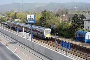 Sydenham railway station is adjacent to the southern perimeter of the airport, across the A2 from the old passenger terminal. It is served by frequent Northern Ireland Railways trains between Bangor and Portadown. Trains towards Portadown call at the Belfast Central and Great Victoria Street railway stations. With the construction of the new passenger terminal further northeast, passengers arriving or departing by train can request an airport courtesy bus to take them to or from the terminal.