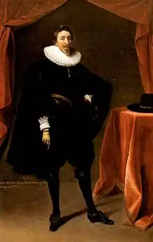 In 1619, Calvert completed his rise to power when James appointed him as one of the two principal secretaries of state. This followed the dismissal of Sir Thomas Lake (1567–1630) due to scandals, including his wife's indiscretions with state secrets.[10][24] Not emerging as a candidate until the end of the selection process, Calvert's appointment surprised him and most observers. Assuming he owed his promotion to the king's increasingly powerful favourite George Villiers (1592–1628) (later first Duke of Buckingham), he sent him a great jewel as a token of thanks. Villiers returned the jewel, saying he had had nothing to do with the matter.[25] Calvert's personal fortune was secured when he was additionally appointed a "commissioner of the treasury" with a pension of £1,000 pounds sterling and a subsidy on imported raw silk, which would later be converted to another £1,000 pension.[26]