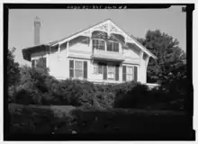 In 1867, Mason's son began working with him, and in 1871, he brought his son into partnership and renamed his firm George C. Mason & Son. In 1873, the firm designed the commanding officer's quarters (today known as the "Eisenhower House") at Fort Adams in Newport, which President Dwight D. Eisenhower used as his summer residence during his administration.[5][6] "Woodbine Cottage," which Mason built for himself in 1873 in collaboration with his son, was a 23-room mansion in an ornate Swiss chalet style. Like the slightly earlier "Edgewater" (1869–70), it features the elaborate kinds of wooden trim that increasingly crept into Mason's later work. It has since been turned into a hotel, the Architect's Inn.[7] Possibly the most stylistically adventurous of Mason's mature work is the "Loring Andrews House", which expresses the Modern Gothic style through facades that are almost completely covered in stick work.[2]