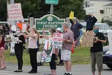 A protest was planned to take place on the evening of June 4. Following the looting that occurred in the Brockton protest a few days earlier, many Taunton businesses boarded up their doors and windows in preparation,[61] and several helicopters and National Guard forces remained on standby around the city once the protest began. A group of about six-hundred people gathered outside of the First Parish Church across from the city's police station in the early afternoon, before most relocated to the nearby city green space, where many encouraged police officers to take a knee in solidarity. Once the officers did so, most protesters dispersed without incident.[62]