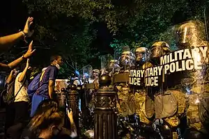 The White House was on lockdown the night of May 29 in response to protests reaching the gates.[2] The protests began at 7:00 p.m. By 8:30 p.m., the White House lockdown was lifted as protesters began to leave. At 10:00 p.m., the protesters returned, however by 3:30 am Saturday the protesters were more subdued. The protesters came into conflict with the United States Secret Service. At times, the protesters got close enough to inflict minor injuries on certain officers. At one point the protesters were pepper sprayed.[3] Several Secret Service agents reportedly suffered broken bones due to rocks and bottles of urine and alcohol thrown at them by rioters.[4][5]