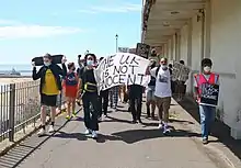 Tens of thousands of people protested across the UK, in cities and towns that included London, Oxford, Liverpool, Manchester, Cardiff, Weymouth, Dorset,[84] Yeovil,[85] Woking,[86] Bognor Regis[87] Wrexham,[88] Bury St Edmunds,[89] Hastings,[90] Dumfries,[91] Glasgow, Coventry, Carlisle,[92] Chester,[93] Lytham St Annes,[94] Middlesbrough,[95] Newcastle,[96] Nottingham,[97] Sheffield,[98] and Wolverhampton.[99][100]