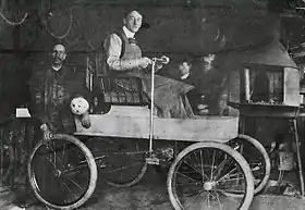 In 1896, Foss traveled to Boston, Massachusetts to purchase a turret lathe for his machine shop.[6] He saw and rode in his first automobile there. It was an electrically driven brougham.[8] After 30 minutes, the batteries in the car died. Upon returning to Sherbrooke, he began to design and build an automobile that would address the problem.[6] He started with a chassis made of old bicycle frames.[4] The Fossmobile's front mounted engine made maintenance easier and produced considerably less upward vibration through the seat. The gear shifter for the Fossmobile was mounted directly on the tiller style steering column, something that was not done by other manufacturers for another 40 years.[5]