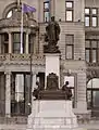 In April 1897 a public meeting in Kolkata agreed to raise funds to mark the Diamond Jubilee of Queen Victoria and, eventually, commissioned Frampton to create a statue of the monarch.[12] Photographs of Frampton's model for the statue were published in the July 1898 edition of The Studio. The accompanying text described a figure over twice life-size, seated under a canopy, wearing the robe of the Order of the Star of India, decorated in gold, ivory and lapis lazuli. The completed statue, which was considerably less ornate and without a canopy, was shipped to India early in 1901 and erected on a temporary site in March 1902.[4] The statue was subsequently moved to a location in front of the Victoria Memorial, where it was sited on a large architectural podium.[4] The death of Queen Victoria in January 1901 led to Frampton receiving several commissions for memorials to the Queen. Frampton based several of these on his design of a seated figure he used for the Kolkata statue but with some variations. He used the same cast for the Leeds and St Helens's statues but changed the style of the decorative details and pedestals between them.[13][14] A further version was created for the grounds of the Manitoba Legislative Building in Winnipeg in 1904.[15] A different design of a much younger, standing Victoria was created for the Royal Victoria Infirmary in Newcastle upon Tyne in 1906 and was unveiled by her son King Edward VII in the same year.[16]