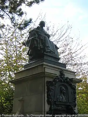 Memorial to Dr Barnardo | Barkingside, London | 1908 | Statue on pedestal with plaque | Bronze and stone | 4.8m high | Grade II* | Q17553256 | [19] |