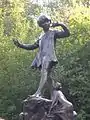 Among Frampton's other notable public sculptures are the figures of Peter Pan playing a set of pipes, the lions at the British Museum and the Edith Cavell Memorial that stands outside the National Portrait Gallery, London.[5] The original Peter Pan statue in Kensington Gardens, London, was commissioned by J.M. Barrie in 1912. Barrie was said to be disappointed at Frampton's depiction of Peter Pan, in particular at his choice of model for the figure of the boy.[17] However such was the popularity of the statue, six more casts were made which are now situated in: