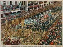 George's silver jubilee in 1888 was celebrated throughout the Hellenic world, and Athens was decorated with garlands for the anniversary of his accession on 30 October.[48] Visitors included the Crown Prince of Denmark, the Prince and Princess of Wales, the Duke and Duchess of Edinburgh, Grand Dukes Sergei and Paul of Russia, and Djevad Pasha from the Ottoman Empire, who presented the King with two Arabian horses as gifts.[49] Jubilee events in the week of 30 October included balls, galas, parades, a thanksgiving service at the Metropolitan Cathedral of Athens, and a lunch for 500 invited guests in a blue and white tent on the Acropolis.[50]
