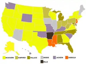 The George McGovern presidential campaign of 1972 began when United States Senator George McGovern from South Dakota launched his second candidacy for the Presidency of the United States in an ultimately unsuccessful bid to win the 1972 presidential election, winning only in the District of Columbia and the state of Massachusetts. McGovern vied to become the first South Dakota native to become president.[2]