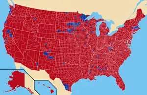 In the election, the McGovern/Shriver ticket suffered a 60.7 percent to 37.5 percent defeat to Nixon and Agnew.[56] At the time, it was the second biggest landslide in American history, with Electoral College totals of 520 to 17. McGovern's two electoral vote victories came in Massachusetts and Washington, D.C.; McGovern failed to win his home state of South Dakota, a state that had delivered for the Democrats in only three of the previous 18 presidential elections in the 20th century.[57] The 1972 election was the first in American history in which a Republican candidate carried every Southern state. Nixon's percentage of the popular vote was only slightly less than Lyndon Johnson's record in the 1964 election, and his margin of victory was slightly larger. Barry Goldwater, who was defeated by Johnson in 1964, sent McGovern a newspaper political cartoon depicting the two of them together "like Grandpa and Granny [patterned after the painting American Gothic] linked by our defeats", with a note scribbled "George -- If you must lose, lose big."[25]