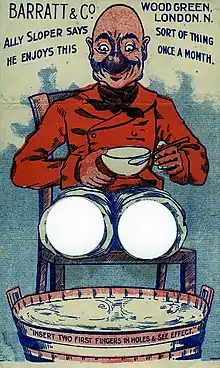 In the early days the product range was mainly “boilings” such as butter, raspberry and ginger toffees. Later it included Almond Rock, Brandy Snaps, Stickjaw, Coffee Almonds, Brandy Nips, Ching Chang Marbles and Coker Tines. Later came Tichborne Rock, a pulled rock in which the figure of Sir Roger Tichborne was incorporated. It was displayed in shop windows with a card saying “Crack the rock where’re you will / You’ll find Sir Roger in it still”. It was said to have been the most talked-about line of confectionery Mr Barratt ever invented.[6]