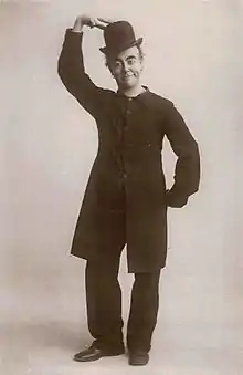 During the 1890s Robey created music hall characters centred on everyday life. Among them were "The Chinese Laundryman" and "Clarence, the Last of the Dandies".[25] As Clarence, Robey dressed in a top hat and frock coat and carried a malacca cane, the garb of a stereotypical Victorian gentleman. For his drag pieces, the comedian established "The Lady Dresser", a female tailor who was desperate to out-dress her high class customers, and "Daisy Dillwater, the District Nurse" who arrived on stage with a bicycle to share light-hearted scandal and gossip with the audience before hurriedly cycling off.[26]